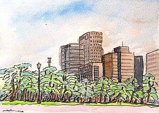 季節の移ろいに流されず青々と枝を伸ばす皇居の松水彩画人気ブログランキン···