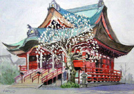 ハクモクレン白が際立つ朱色の本堂水彩画人気ブログランキング···