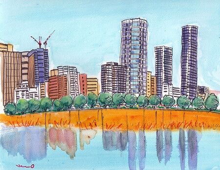上野不忍池のさくらが散ると新緑の若葉が並木を覆う。水彩画人気ブログランキング···