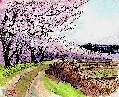 手賀沼北岸の桜並木水彩画人気ブログランキング···
